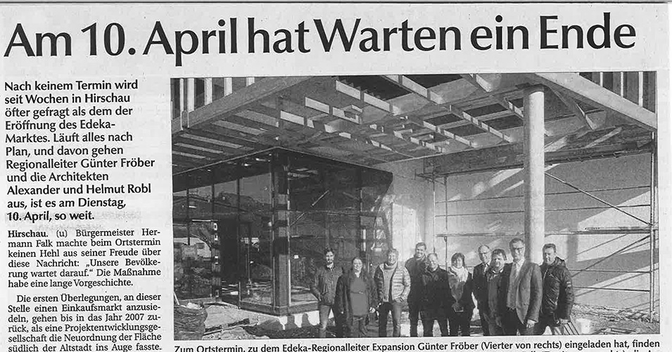 Nach keinem Termin wird seit Wochen in Hirschau öfter gefragt als dem der Eröffnung des EDEKA-Marktes. Läuft alles nach Plan – davon gehen EDEKA-Regionalleiter Günter Fröber und die Architekten Alexander und Helmut Robl aus – ist es am Dienstag, 10. April, so weit. Bürgermeister Hermann Falk machte beim Ortstermin keinen Hehl aus seiner Freude über diese Nachricht: „Unsere Bevölkerung wartet darauf!“ Angesichts der langen Vorgeschichte könnte man auf die Marktansiedlung das Sprichwort anwenden „Gut Ding will Weile haben“.