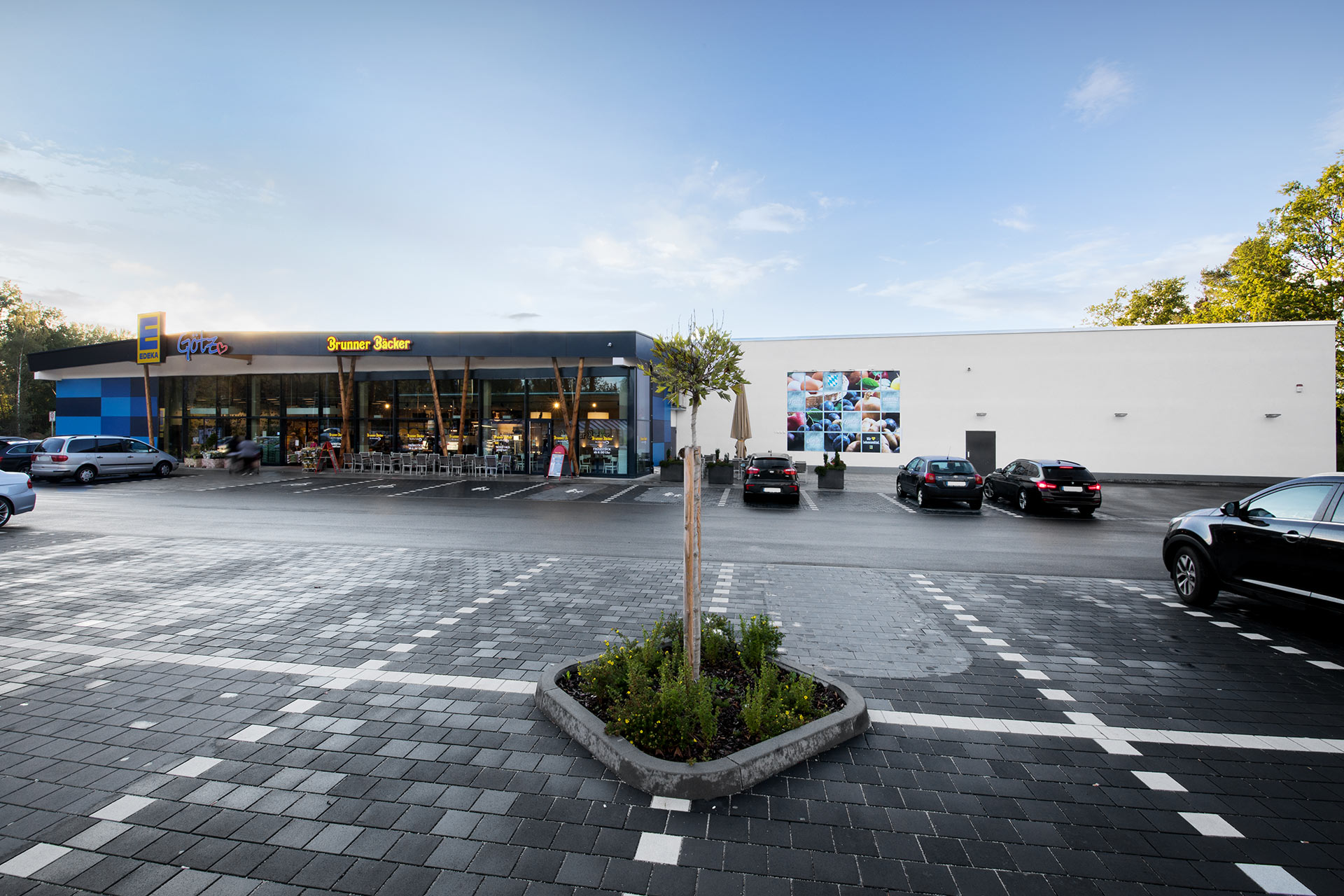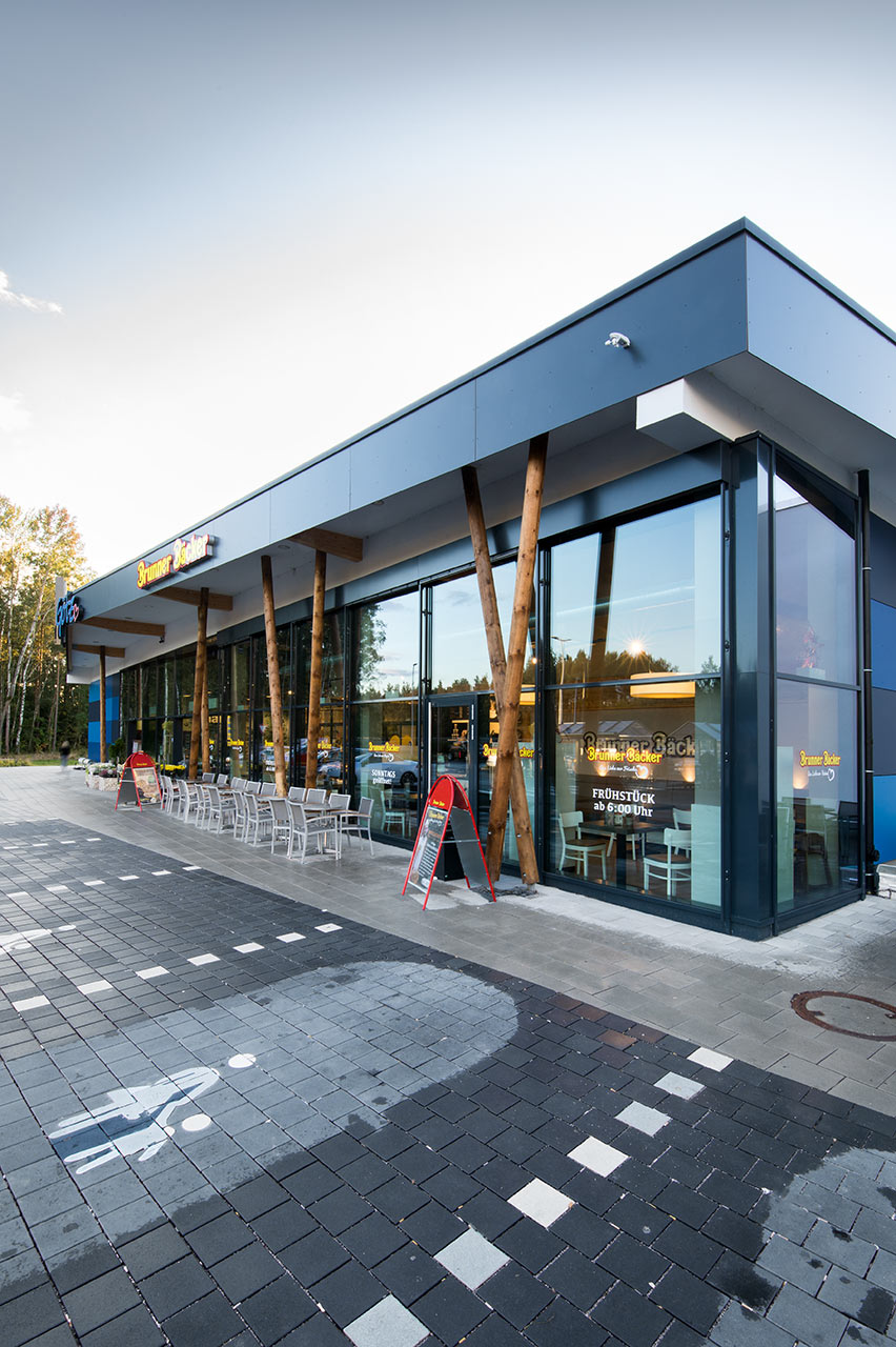 EDEKA Götz in Etzenricht mit ca. 1.500 m² Verkaufsfläche. Die außergewöhnliche Fassade zeigt: EDEKA liebt nicht nur Lebensmittel, sondern auch Architektur. Dunkle Fassaden-Platten in den bekannten Edeka-Farben und ein neu interpretierter Dach-Sattel im Eingangsbereich beziehen sich einerseits auf den typischen regionalen Baustil und zeigen dennoch Einzigartigkeit. Im offenen und überdachten Eingangsbereich nehmen zudem schräg-vertikal eingebrachte Baumstämme Bezug auf den Wald in der Umgebung.