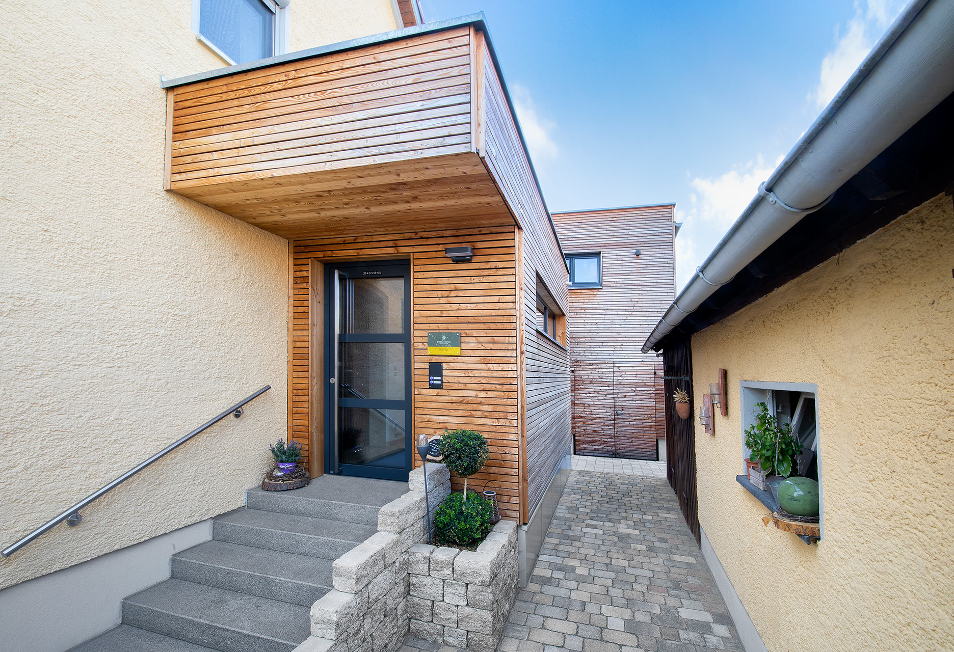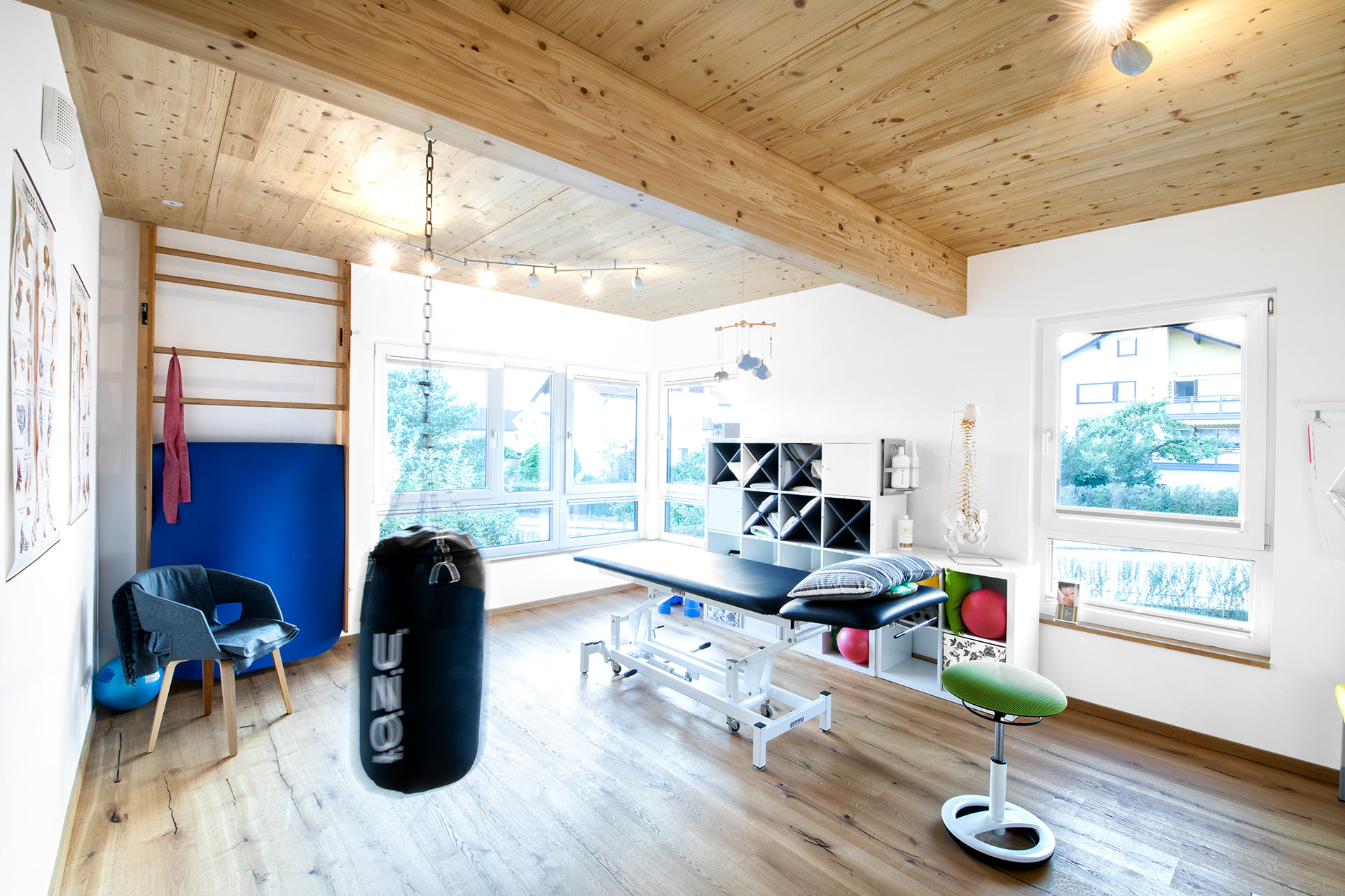 Eine Treppe führt im neu gestalteten Eingangsbereich hinauf in die Physiopraxis, die an das Bestandsgebäude aus den 50er Jahren als Kubus angebaut wurde. Von außen zeigt sich diese Schräge durch polygonal angeordnete Plattenelemente. Innen sorgen Dielen und Türen aus Eiche, große Fensterflächen und Massivholzdecken für eine angenehme Atmosphäre. Der Clou der Schräge: durch das Aufständern entstand darunter (ebenerdig) ein großer lichtdurchfluteter Abstellraum für Räder, Gartengeräte etc.