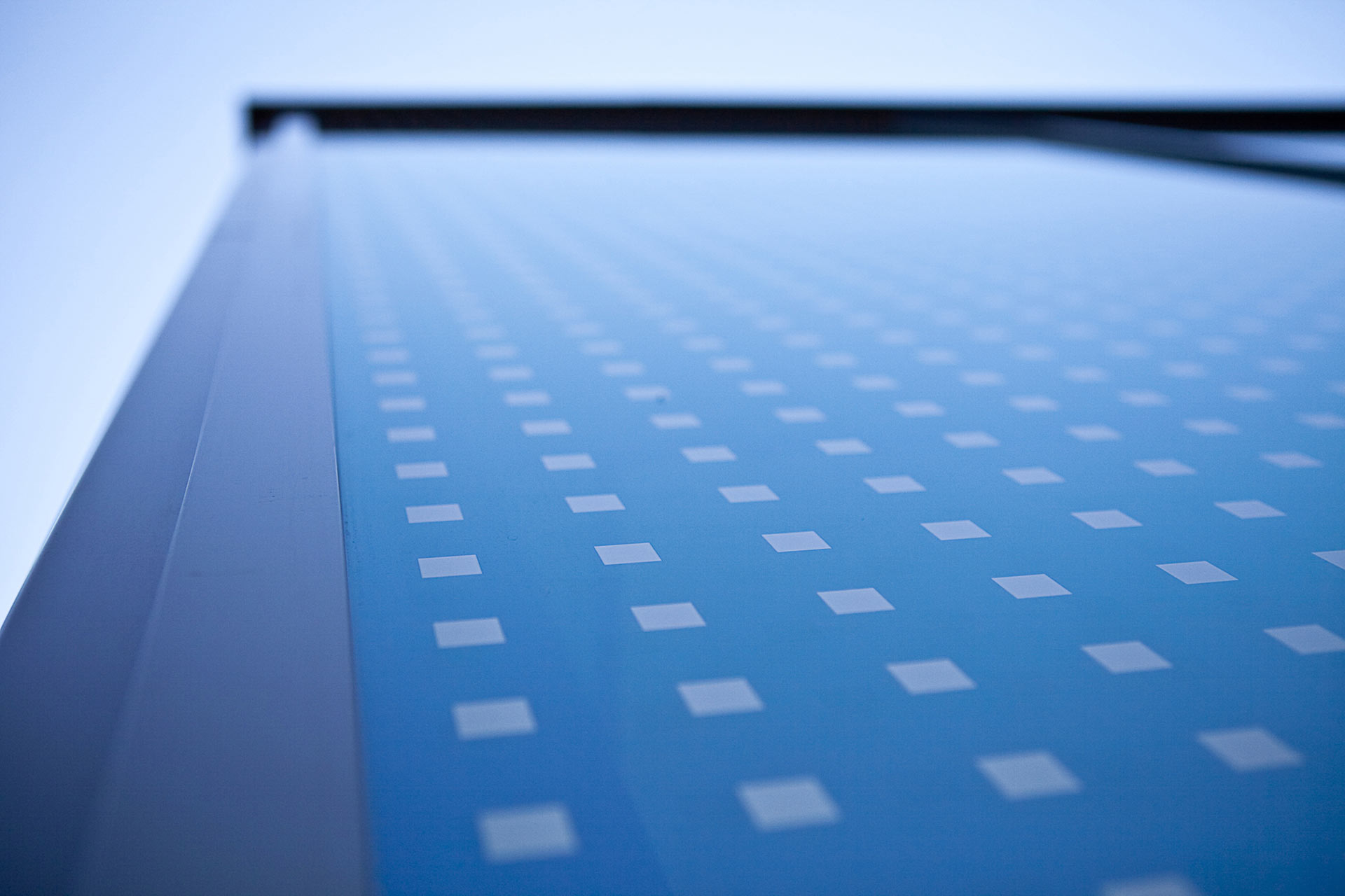 Die Gestaltung der Glasflächen der Fassade basiert auf einem Raster mit unterschiedlich großen Quadraten. Je nach Abstand und Blickwinkel variiert das Erscheinungsbild. So können bei Betrachtung aus der Nähe Quadrate in verschiedenen Größen gesehen werden. Von der Ferne betrachtet fügen sich die Quadrate zu Umrissen von Sportlern zusammen.