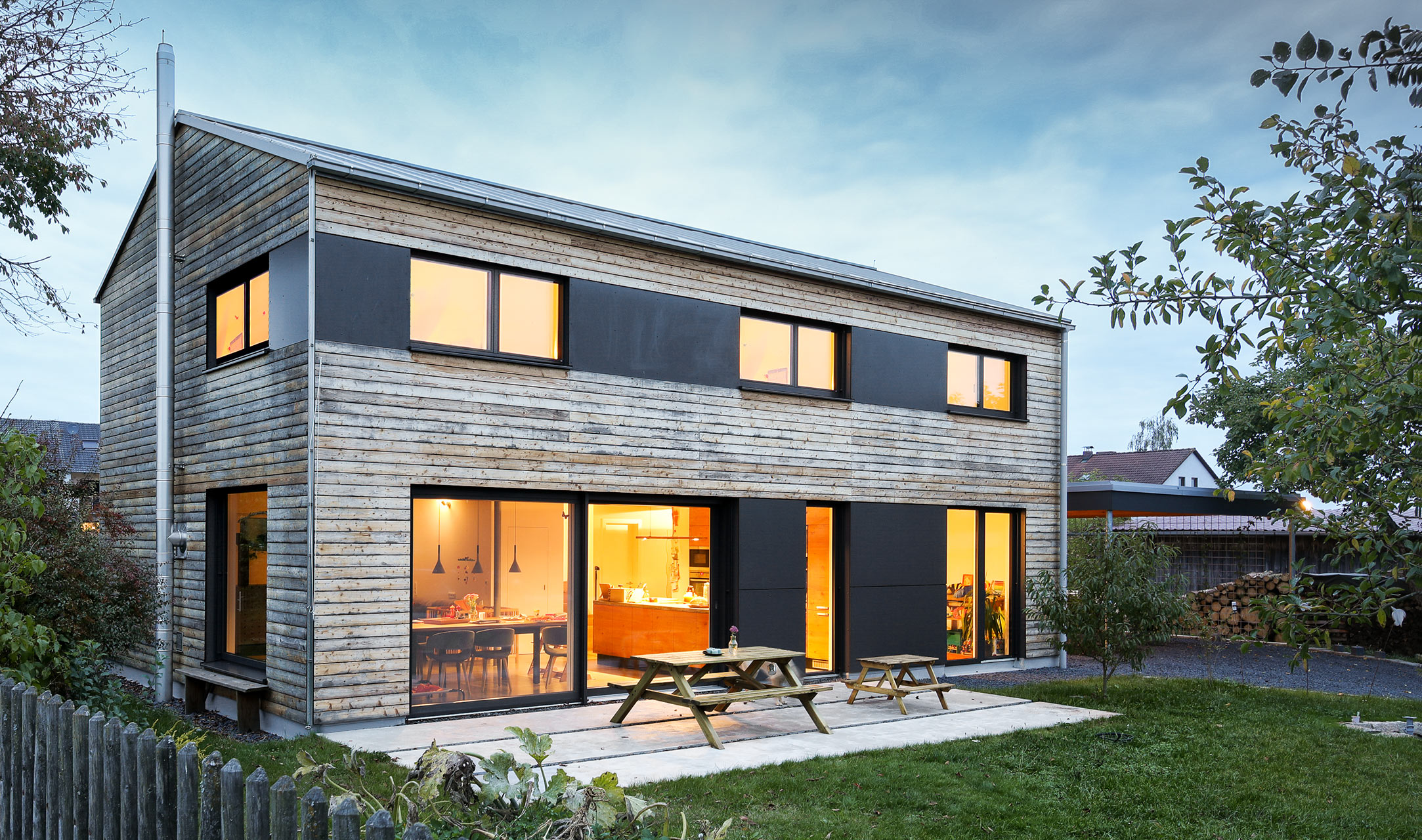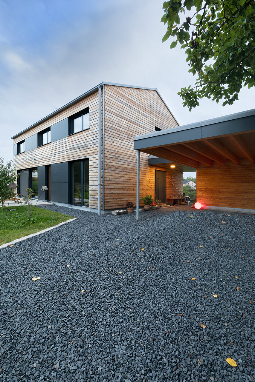 Energieeffizientes Holzhaus am Ende einer Stichstraße mit einer Holzfassade (Lärche, unbehandelt) und Plattenelementen, die wie Bänder wirken. Unbehandelte Natur als Bilderrahmen für den schlichten Entwurf – ein Paradies, auch für die Hunde und Katzen. Der Gedanke der Verknüpfung von Tradition mit dörflichem Charakter und moderner Bauweise zeigt sich auch bei der Gartengestaltung. So finden sich hier sowohl bayerische Accessoires als auch Elemente in Sichtbeton. Im Inneren befindet sich im ganzen Haus ein Sichtestrich und auch die Küchenplatte wurde aus Beton geschalt. Das Dach ist in diesem Fall als flacheres Satteldach umgesetzt, welches wiederum mit einem minimalen Dachüberstand auskommt. Auch am Carport, welches als Flachdach ausgeführt ist, sind die dunklen Plattenelemente zu finden und sorgen so für ein homogenes Ganzes.