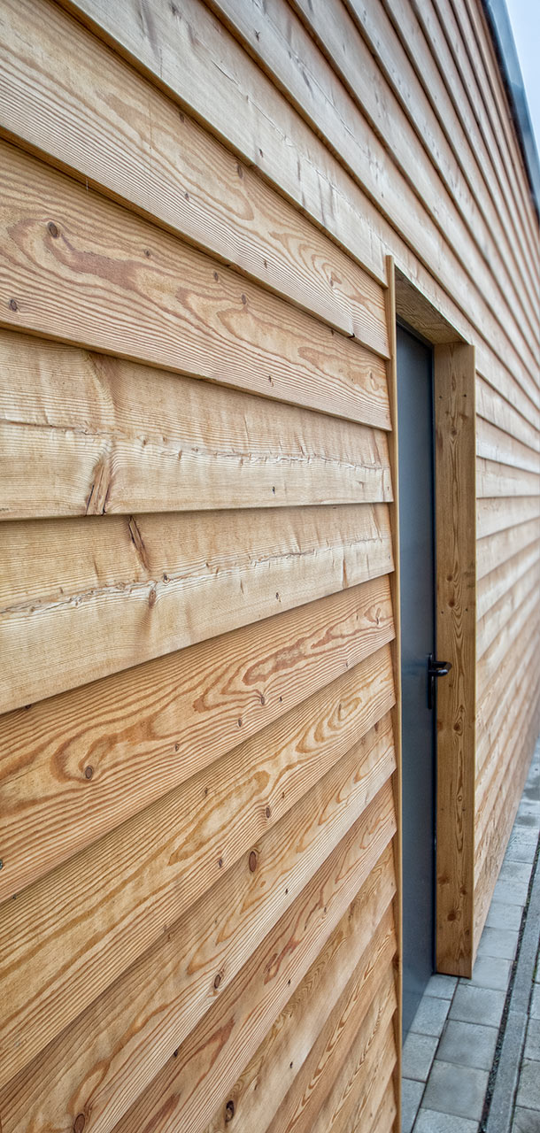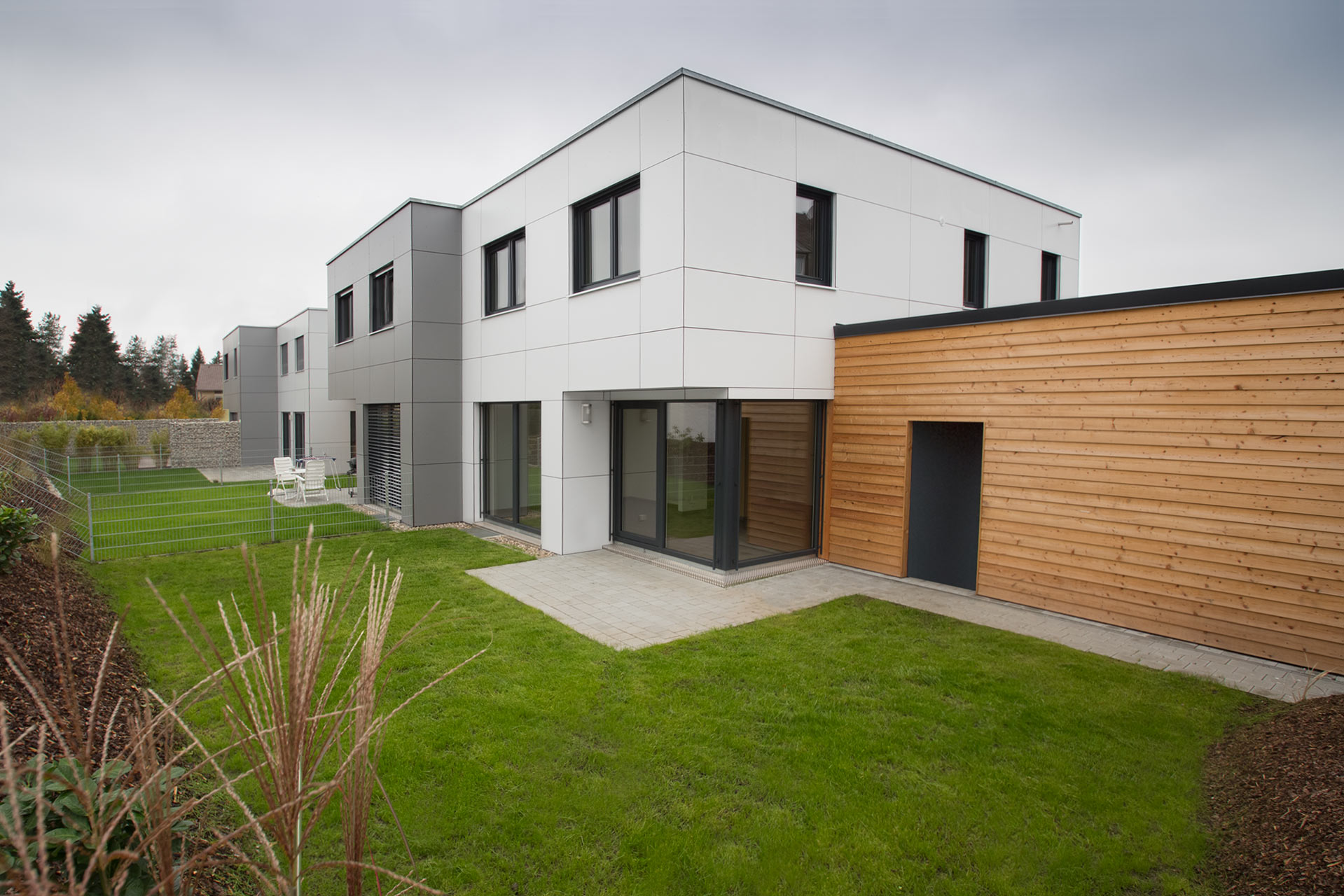 Die acht Doppelhaushälften sind Niedrigenergiehäuser (Energieeffizienz: KfW 55) in hochgedämmter Holzständerbauweise (Holzständer ausgeflockt mit Zellulose). Die Senova-Plattenverkleidung als hinterlüftete Fassade bietet einerseits dauerhaften Wetterschutz ohne weitere Pflegemaßnahmen, andererseits sommerlichen Wärmeschutz: Die Hitze steigt durch die Thermik hinter den Platten in der hinterlüfteten Ebene nach oben und entweicht an der Attika, wodurch sich die Wand nicht erwärmen kann. Die im Keller innen aufgestellte Luft-Wärmepumpe für Fußbodenheizung und Trinkwasser kann außerdem an die Photovoltaikanlage gekoppelt werden. Abgerundet wird das Konzept durch die Lüftungsanlage mit Wärmerückgewinnung. Mittels der verschiedenen Grautöne erhält jedes Haus eine eigene „Adresse“, durch die der Hauseigentümer eine zusätzliche Identifikation erfährt. Die zwei Reihen mit je vier Häusern werden über Privatwege erschlossen. Besonders schön: Im Süden schließt eine wunderbare Gartenanlage an, auf die die großen Fenster einen perfekten Blick freigeben.