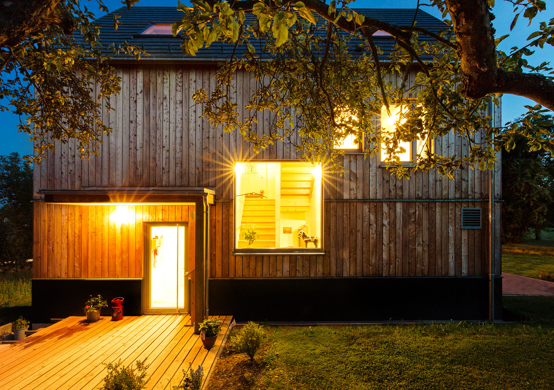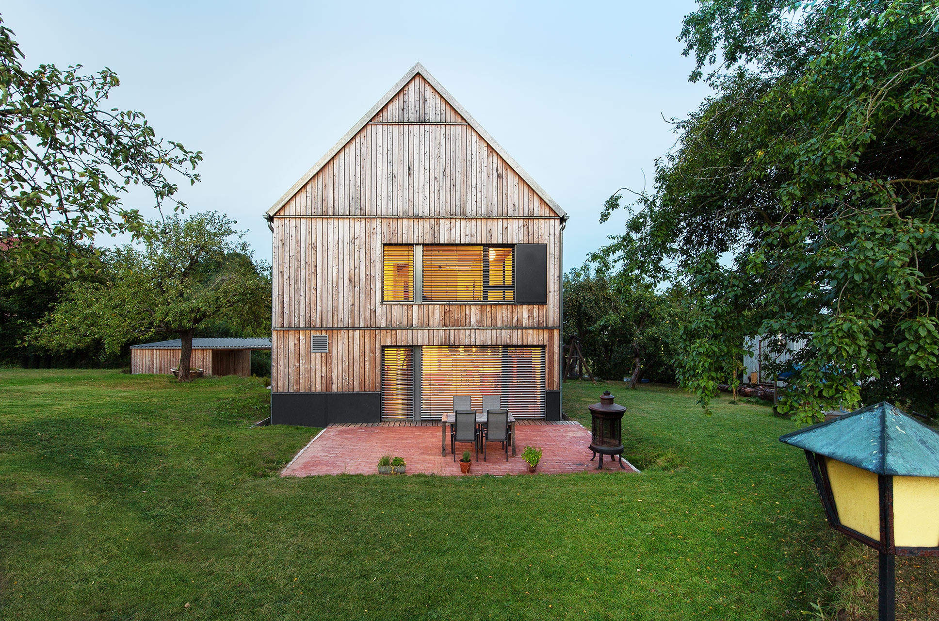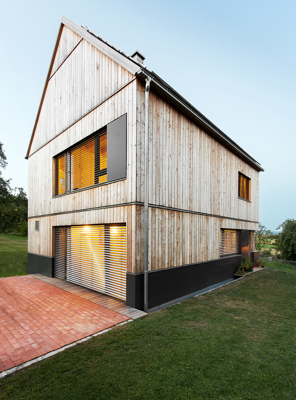 Holzhaus (KfW 55) mit senkrechter, unbehandelter Fichten-Lattung. Das spitze Satteldach fügt sich unaufdringlich ins Ortsbild ein. Mit einem geringen Dachüberstand entsteht eine Anlehnung an die Gesims-Ausführung im Oberpfälzer Baustil. Das Resultat ist ein Natur-Ensemble: im Süden der alte Bauernhof, die über 100 Jahre alte Landwirtschaft, im Norden eine Obstbaumwiese, und im Westen Äcker und Felder. Für eine zukunftsorientierte Bauweise sorgen ein Kompaktgerät als Heiz- und Lüftungszentrale sowie ausreichend Büro- und Lagerflächen im Dachgeschoss. Das offene Treppenhaus dient als vertikale Verbindung zwischen den Geschossen mit großem Nordfenster zur Obstbaumwiese. Innen mit Sichtbalkendecken über dem Erdgeschoss wird auch hier die modern interpretierte regionale Idee perfekt aufgegriffen. Zur Straße ist ein Carport mit Abstellraum im Splitlevel-Stil untergeordnet vorgelagert.