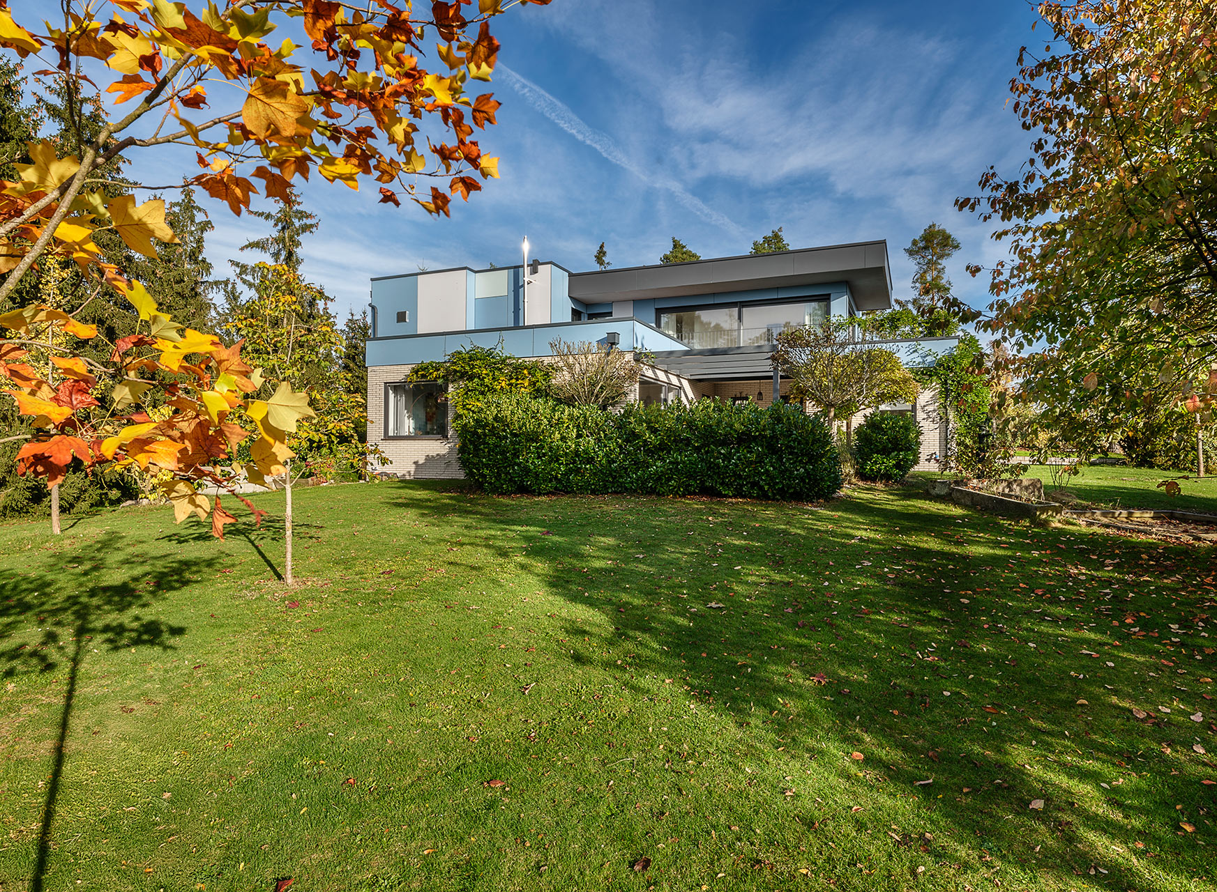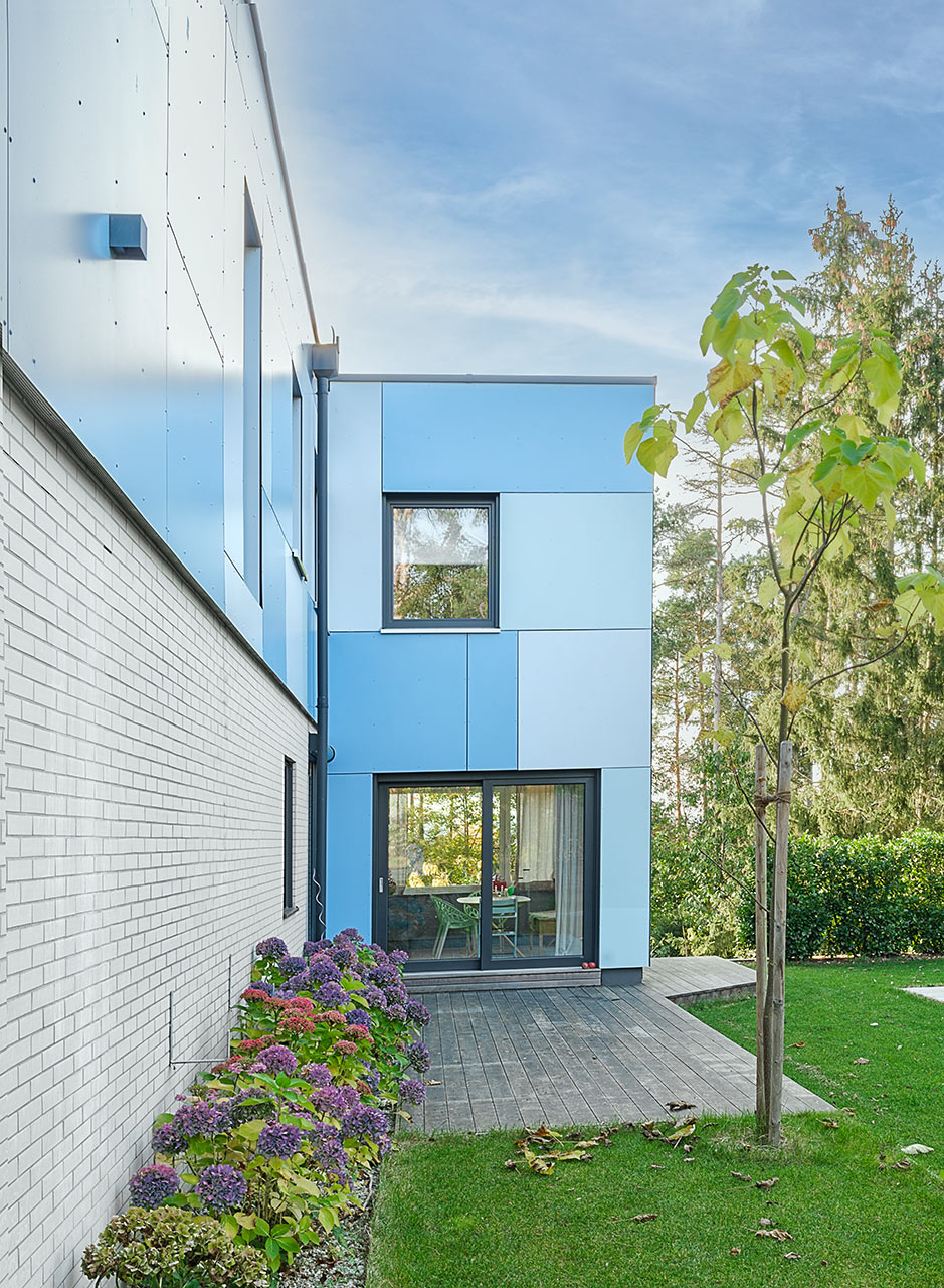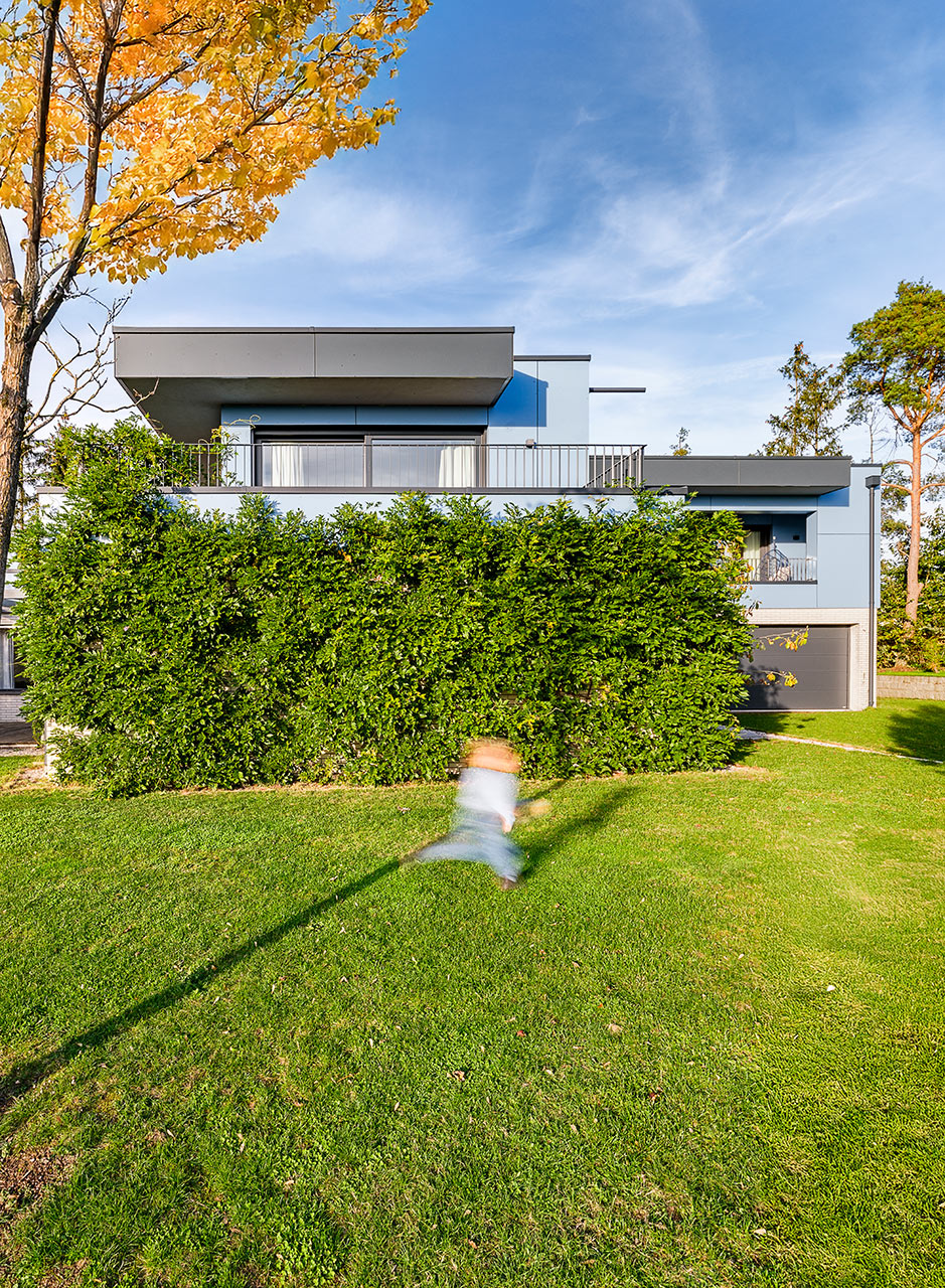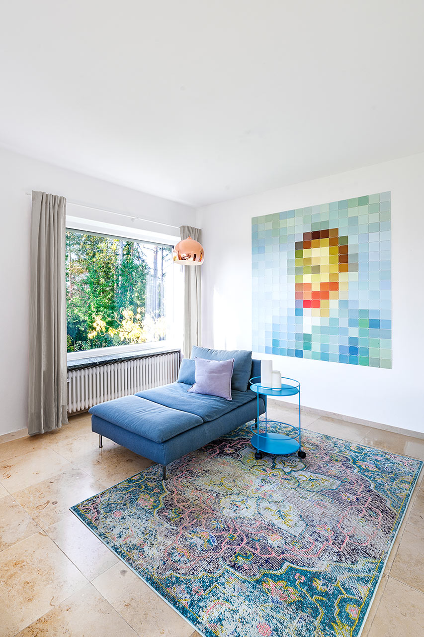 Bei dieser Aufstockung ist das Bestandsgebäude ein Bungalow in Massivbauweise. Die Materialität der Fassade im EG fand in damaligen Zeiten durch regional angesiedelte Unternehmen ihren Ursprung. Dies sollte unbedingt so bleiben. Eingebettet in wunderschöne Natur mit einem atemberaubendem Ausblick entstand durch die Aufstockung in Holzbauweise ein leicht verschachtelter, kubischer Baukörper. Fassadenplatten in wechselnden Farben bilden einen Kontrast zur Bestandsfassade und wissen dennoch mit ihr geschickt zu harmonieren. Auskragende Vordächer prägen die Gebäudeform und bilden zugleich einen natürlichen Regen- und Sonnenschutz. Dies wiederum ist dienlich bei großen Fensterfronten. Die Grundrisse sind modern und offen gehalten. Der Bauherrin war es wichtig, den Spirit des Hauses zu bewahren. Und so war es natürlich klar, dass auch die gelben Original-Fliesen in der Küche genau da bleiben, wo sie ursprünglich schon waren. Die Möblierung unterstreicht das Mid-Century-Flair, welches das ganze Haus umgibt.