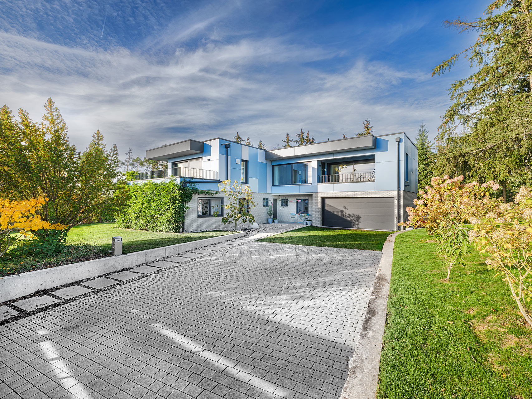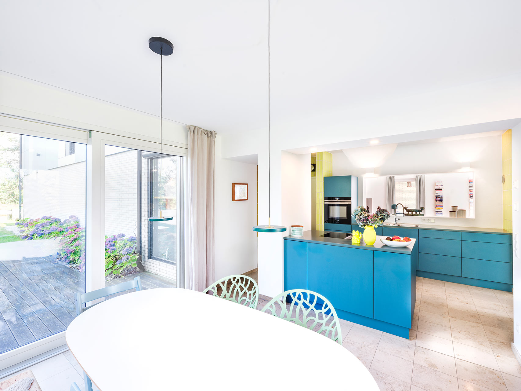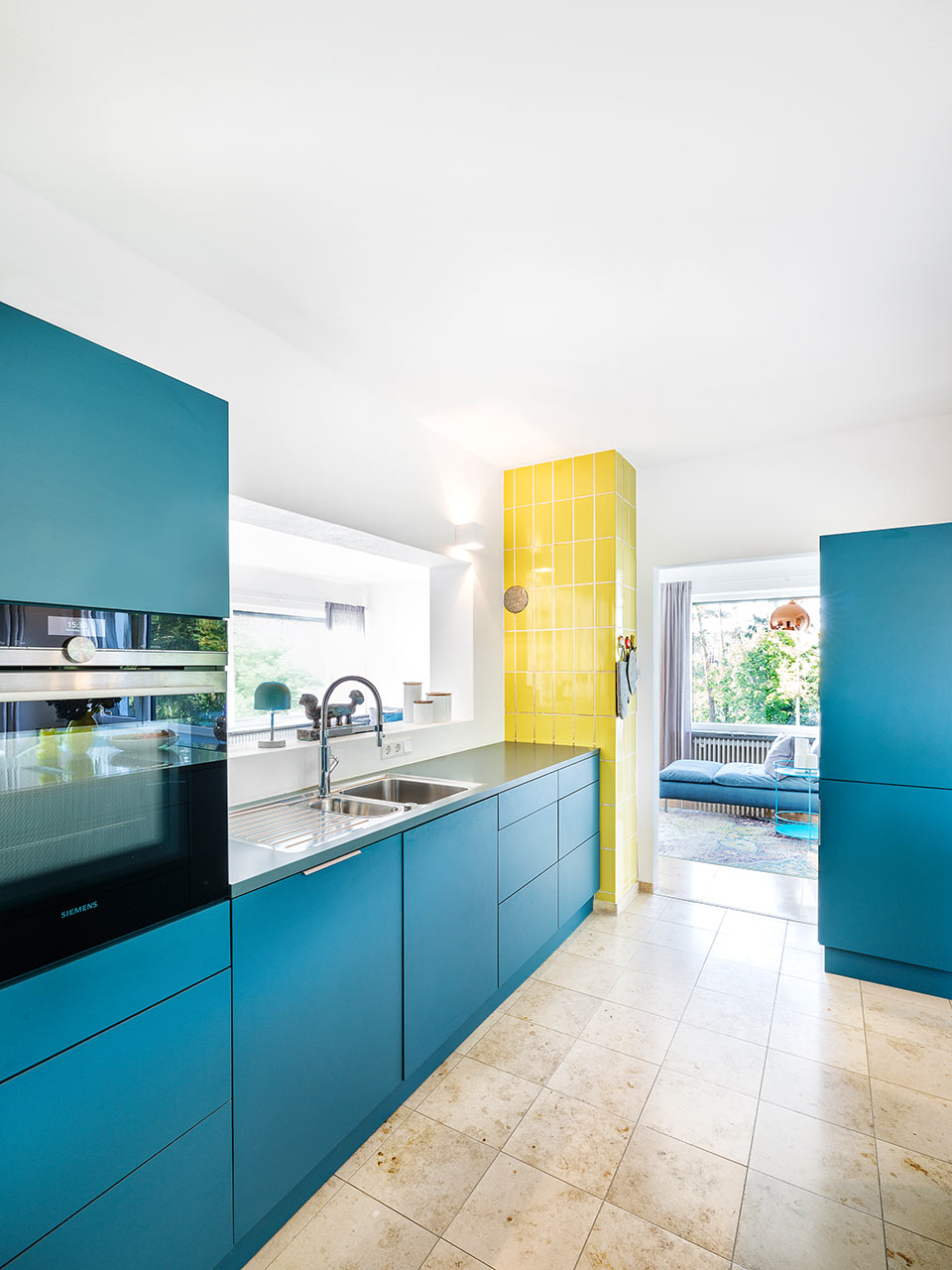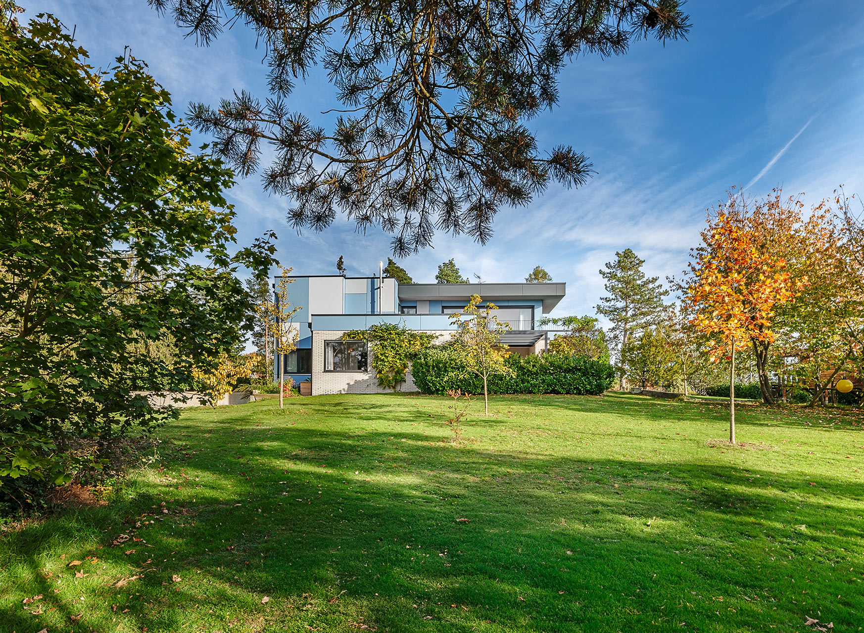Bei dieser Aufstockung ist das Bestandsgebäude ein Bungalow in Massivbauweise. Die Materialität der Fassade im EG fand in damaligen Zeiten durch regional angesiedelte Unternehmen ihren Ursprung. Dies sollte unbedingt so bleiben. Eingebettet in wunderschöne Natur mit einem atemberaubendem Ausblick entstand durch die Aufstockung in Holzbauweise ein leicht verschachtelter, kubischer Baukörper. Fassadenplatten in wechselnden Farben bilden einen Kontrast zur Bestandsfassade und wissen dennoch mit ihr geschickt zu harmonieren. Auskragende Vordächer prägen die Gebäudeform und bilden zugleich einen natürlichen Regen- und Sonnenschutz. Dies wiederum ist dienlich bei großen Fensterfronten. Die Grundrisse sind modern und offen gehalten. Der Bauherrin war es wichtig, den Spirit des Hauses zu bewahren. Und so war es natürlich klar, dass auch die gelben Original-Fliesen in der Küche genau da bleiben, wo sie ursprünglich schon waren. Die Möblierung unterstreicht das Mid-Century-Flair, welches das ganze Haus umgibt.