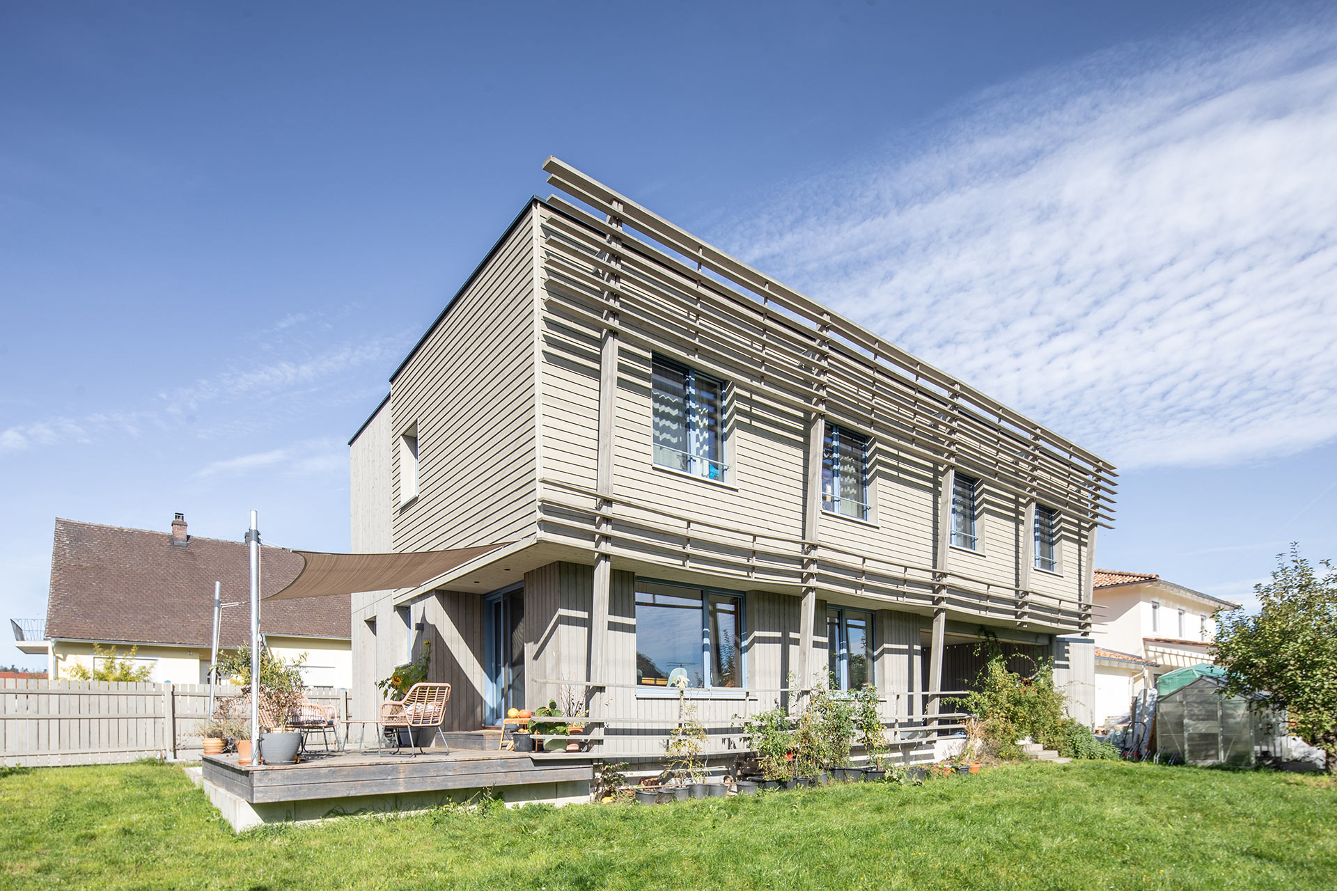 Ein markante Holzverkleidung, die zugleich als natürlicher Sonnenschutz dient, verleiht diesem Haus ein besonderes Erscheinungsbild. Wichtig war der Bauherrschaft der Bezug zur Natur und eine möglichst geschickte Nutzung des verfügbaren Raums. Horizontal und vertikal angeordnete Fugen wechseln sich bei der Holzverkleidung ab und gliedern optisch das Gebäude in einzelne Baukörper. Bei den Farben der Fenster sorgt das helle Blau ebenfalls für ein natürliches, nicht zu strenges Ambiente.